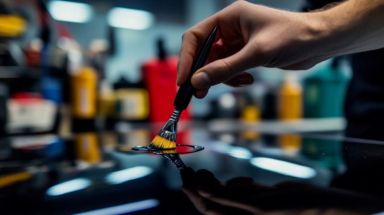 L'application d'une couche de vernis transparent est une étape cruciale qui assure la protection de la peinture contre les agressions extérieures telles que les rayons ultraviolets, les intempéries et les petits chocs. Le vernis joue également un rôle esthétique en apportant de la profondeur et de la brillance à la retouche. Comme pour la peinture, le vernis doit être appliqué en couches fines et régulières, en respectant les temps de séchage recommandés par le fabricant. Il est conseillé d'appliquer au moins deux couches de vernis pour garantir une protection optimale. Le respect des délais de séchage est essentiel pour éviter les défauts de finition tels que les coulures ou les zones mates. Une fois le vernis complètement sec, la retouche est solidement protégée et peut résister aux agressions quotidiennes.